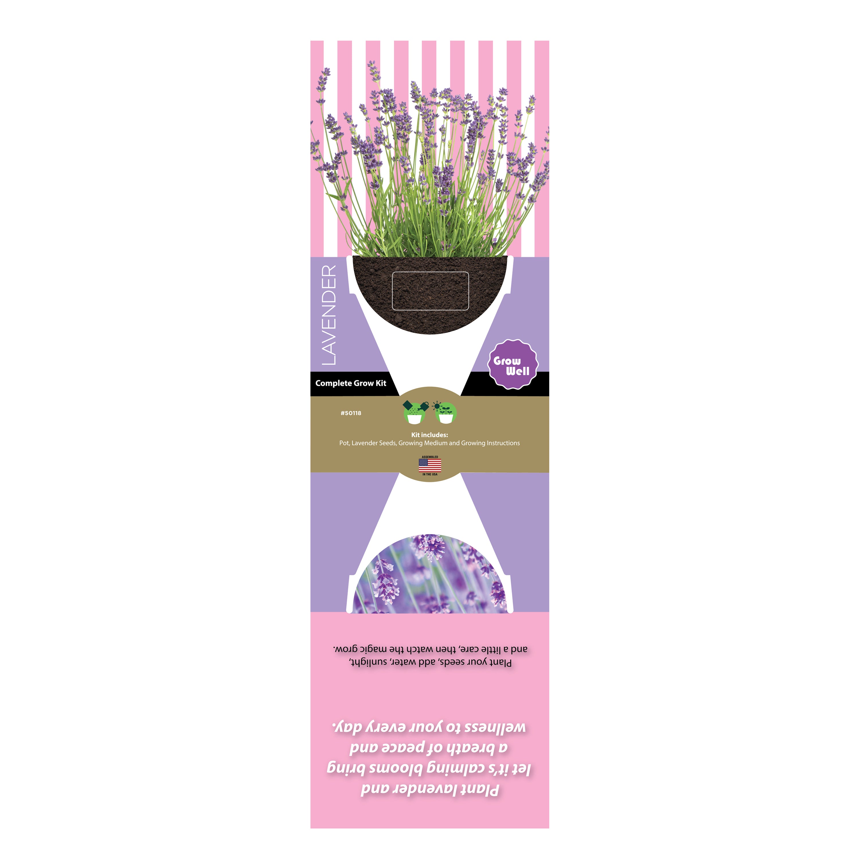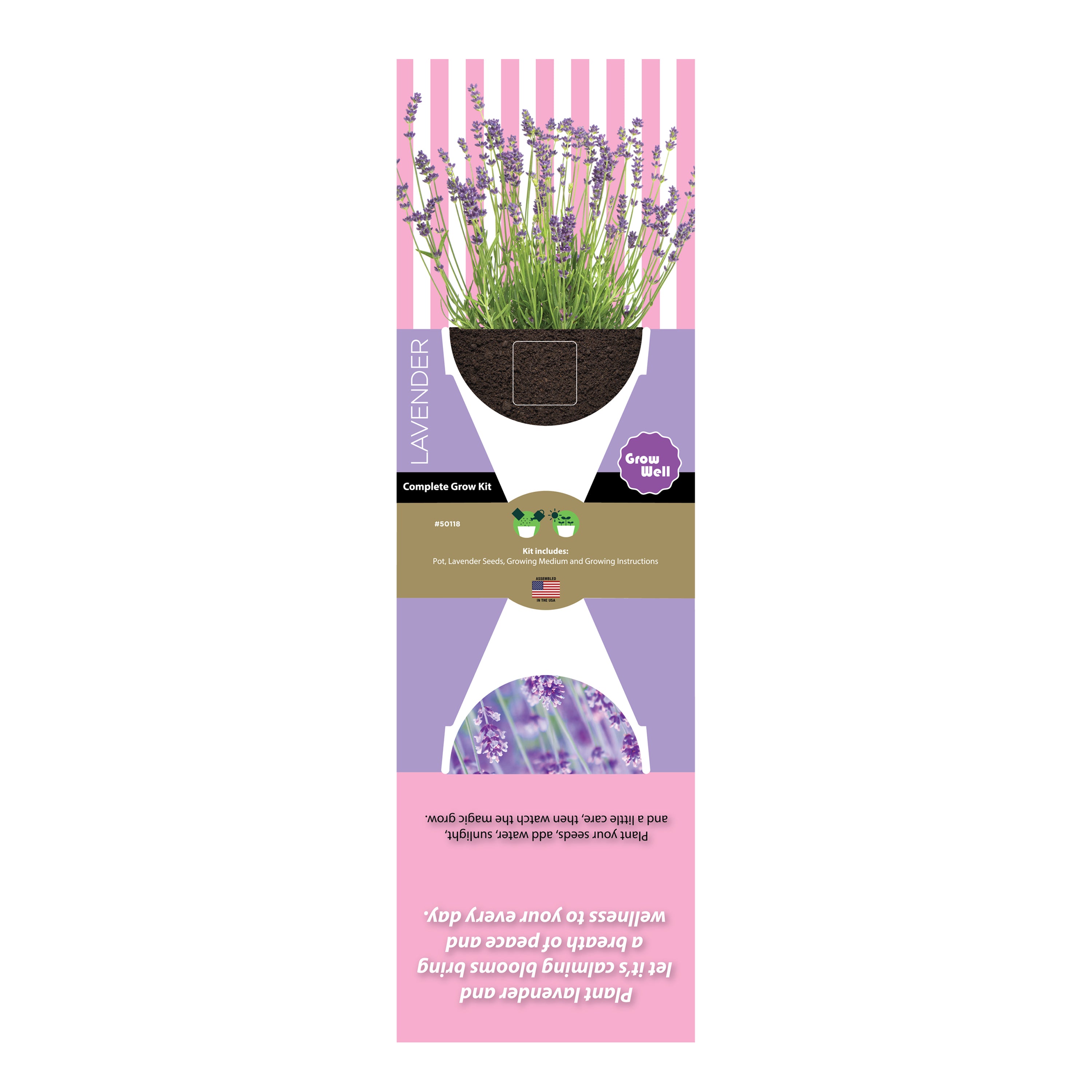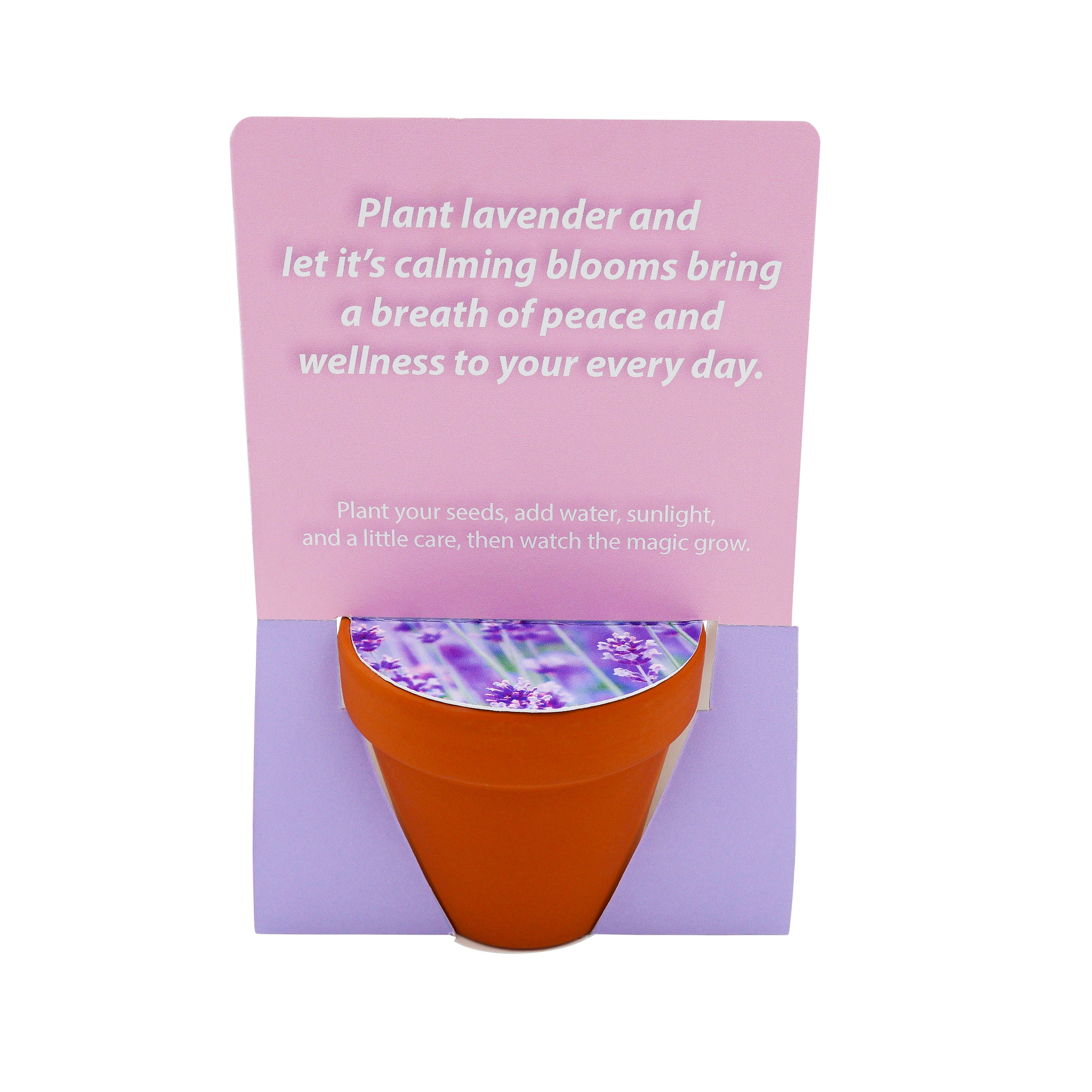 Each 2.75" kit includes a genuine terracotta pot, natural coconut husk growing medium, and premium lavender seeds, prized for their calming aroma and easy growth. The terracotta’s earthy aesthetic enhances any space, while the lavender offers lasting fragrance and serenity—ideal for wellness brands, spas, and mindful lifestyle promotions.